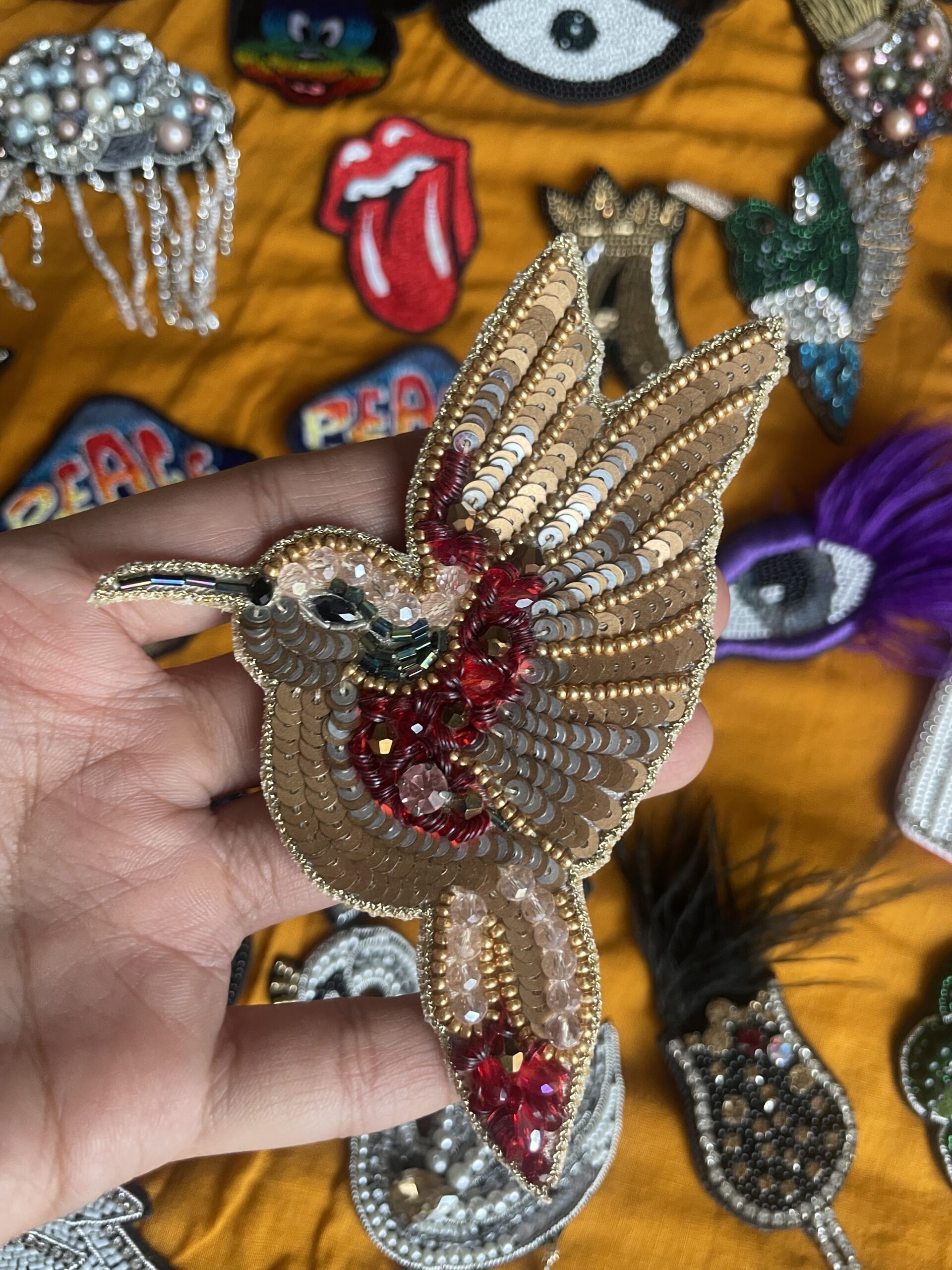 If you love handmade brooches, embroidered bird brooches, statement accessories, and artistic fashion pins, the Golden & Red Hummingbird Brooch is a must-have for your collection.
