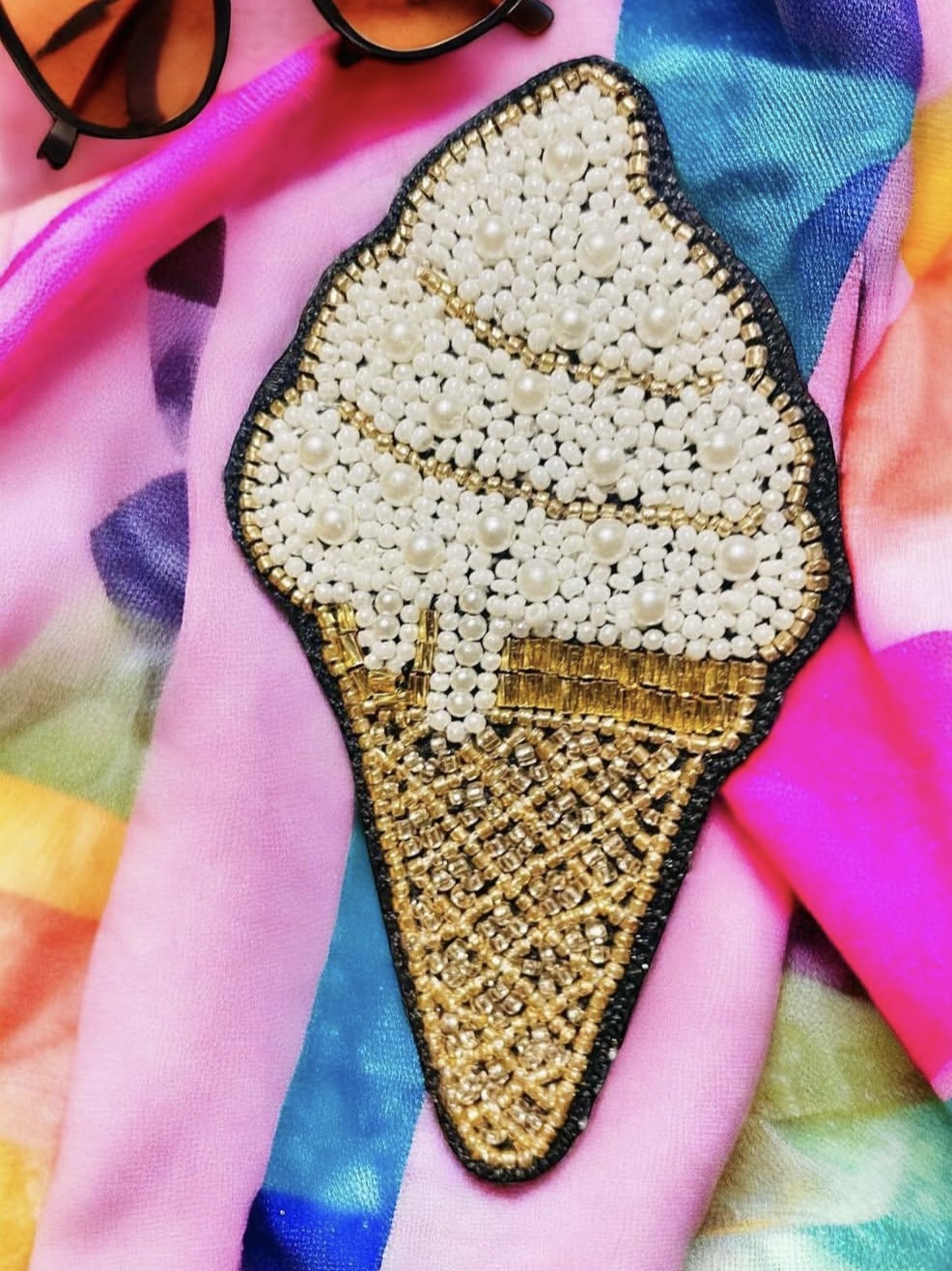 Carefully handmade with intricate embroidery, the brooch features premium threads, shimmering beads, pearls, and sequins that bring the ice cream design to life. The creamy vanilla tones paired with textured detailing create a realistic and eye-catching look, making it a charming statement accessory.