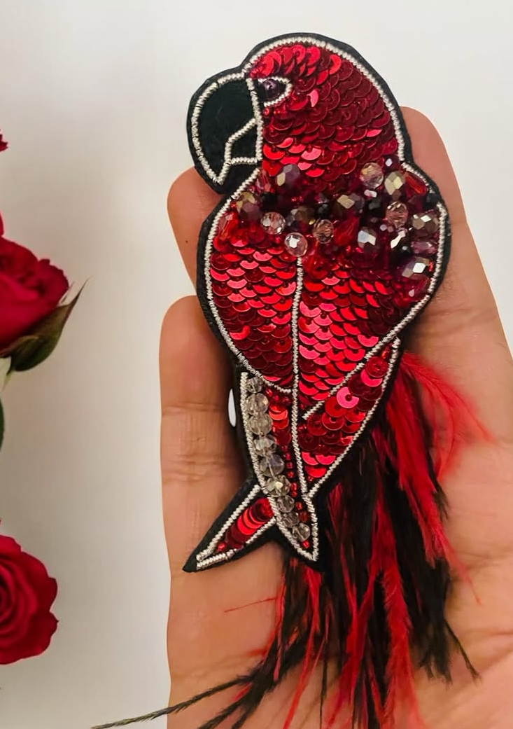 Each Red & Black Parrot Brooch is carefully handmade with intricate embroidery and detailed craftsmanship. The design highlights the graceful shape of the parrot, including its curved beak and elegant feathers, turning the brooch into a small piece of wearable art. Because every brooch is handcrafted, each piece carries its own unique character and charm.
